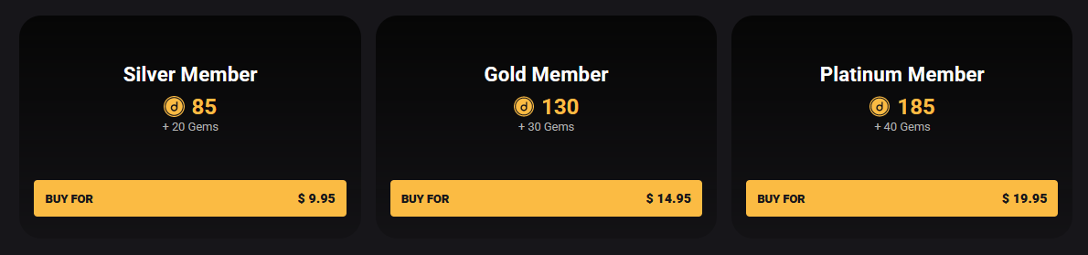 | Pricing: | Silver subscription: $9.95/m Gold subscription: $14.95/m Platinum subscription: $19.95/m |